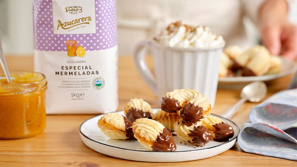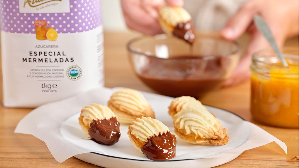7. Rellenar las galletas con la mermelada (si os gusta muy fina triturar) y mojar la punta en el chocolate derretido. Dejar enfriar en la nevera unos 5-6 minutos y servir