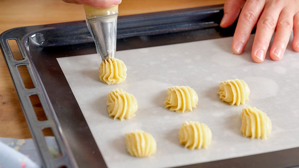 5. Introducir en una manga pastelera de boquilla rizada y formar las galletas sobre la placa de horno forrada de papel de horno o de un tapate de silicona. Cocer en el horno, Precalentado a 190ºC, durante 12-15 minutos, que empiecen a dorarse. Retirar y reservar.