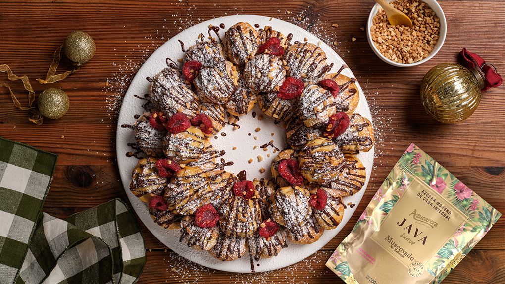 8. Sobre un plato de servir, montar un roscón con los profiteroles rellenos. Derretir 2/3 del chocolate en el microondas y agregar el tercio restante picado. Mezclar, añadir también el aceite y remover hasta que se integre.