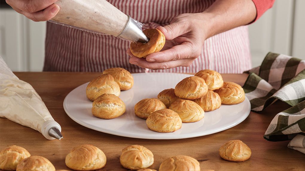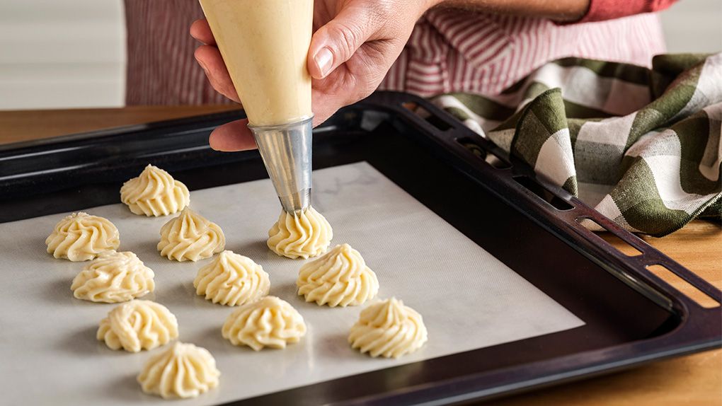 3. Introducir la masa en una manga pastelera de boquilla lisa o rizada y formar bolitas de masa del mismo tamaño, separadas entre sí, sobre una placa de horno forrada con papel sulfurizado. Cocer en el horno, precalentado a 180ºC, durante 25-30 minutos hasta que tengan un color dorado. Dejar enfriar.