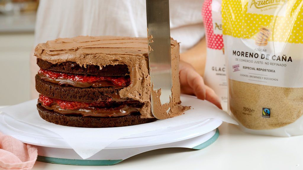Con un cuchillo de sierra, igualar los bizcochos, cortando la parte abombada. Colocar un poco de cobertura en el plato y situar encima el primer bizcocho, de esta manera no se moverá el bizcocho mientras se manipula. Colocar una parte de la ganache y repartir sobre el bizcocho. Colocar 2 cucharadas del relleno de frambuesas y tapar con el siguiente bizcocho. Repetir la operación de ganache y relleno de frambuesas y colocar el último bizcocho.