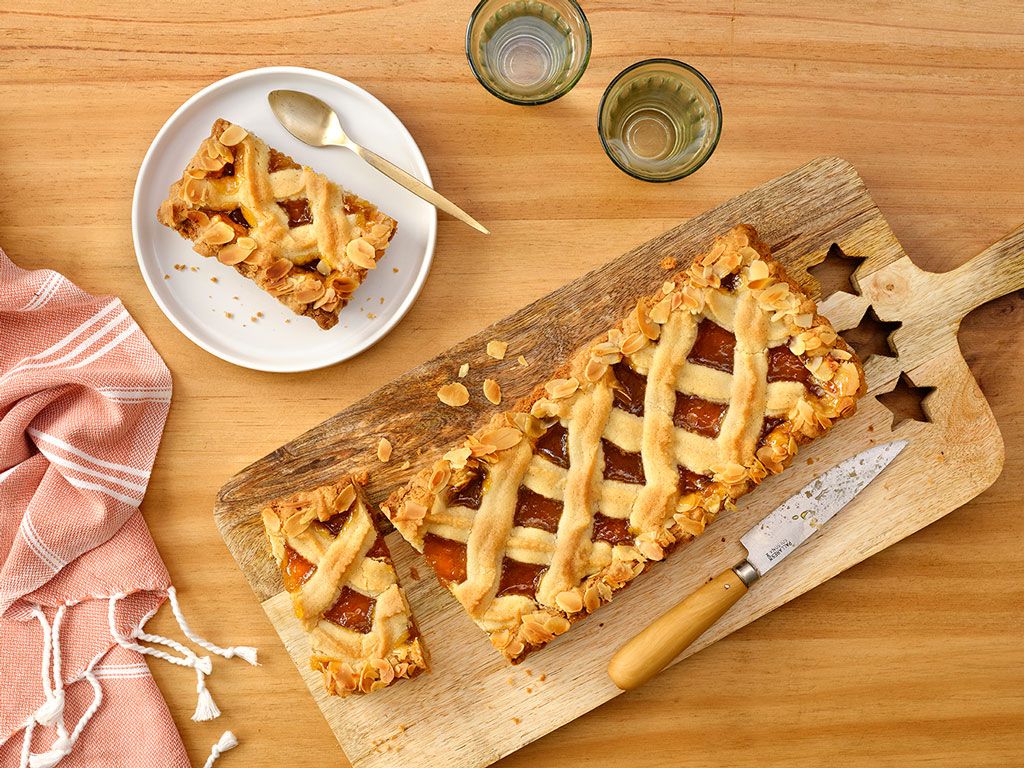 5. Colocar la masa de cobertura sobre la mermelada, en líneas en diagonal hacia un sentido y otras en el otro sentido, para conseguir el enrejado. Espolvorear la almendra laminada alrededor del borde la tarta. Introducir en el horno precalentado a 180ºC y cocinar unos 30-35 minutos o hasta que la tarta esté dorada.