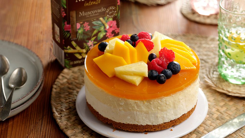 • Poner en remojo en agua fría las dos hojas de gelatina restantes. Calentar el resto de puré de maracuyá y diluir las hojas de gelatina escurridas. Dejar entibiar y verter sobre la tarta de queso. Dejar reposar en la nevera durante 3-4 horas.
