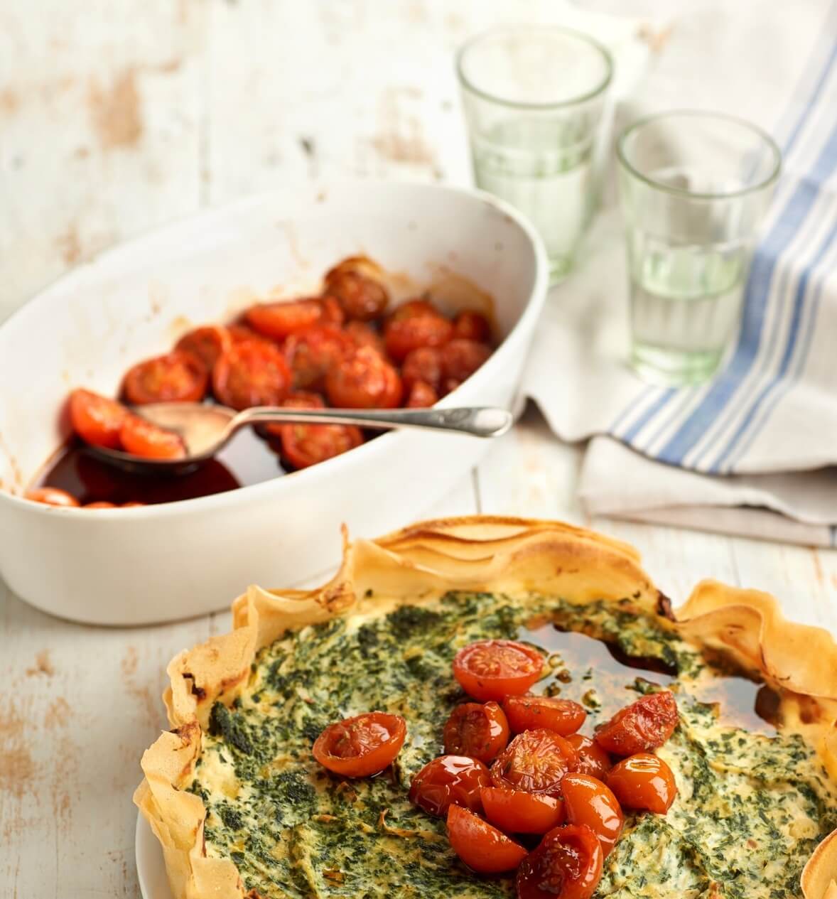 ¿Tienes invitados para comer y no sabes que preparar? Sorpréndeles con esta tarta de puerro, espinacas, ricotta con tomatitos caramelizados.