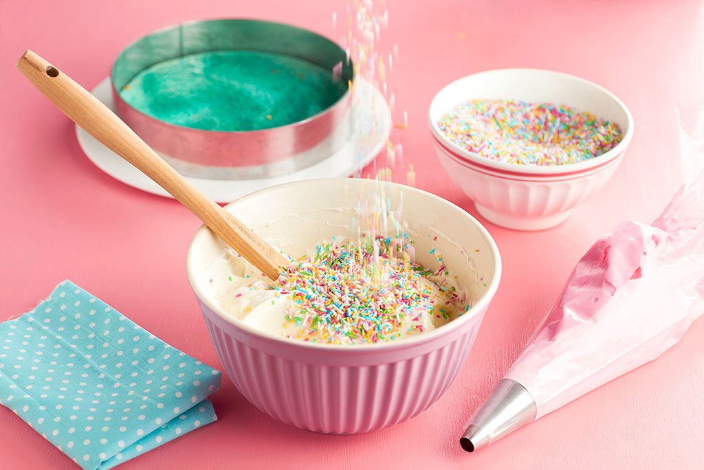 6. Vertemos la crema con confetis sobre la base de bizcocho con el aro y dejamos reposar en la nevera durante 20 minutos