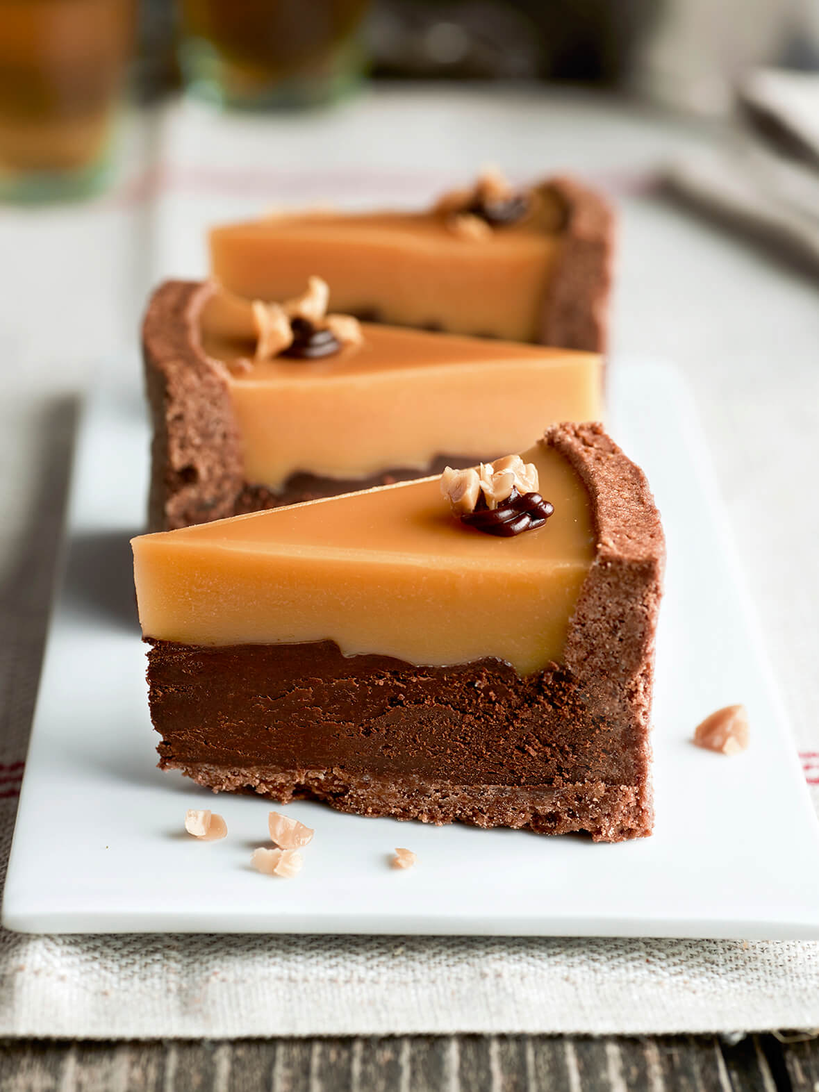 5 Preparar el toffee: Poner en remojo la gelatina. Verter el azúcar en un cazo con 1 cucharadita de agua y cocer hasta obtener un caramelo rubio. Agregar la nata y la mantequilla y remover hasta obtener una salsa lisa. Escurrir la gelatina, añadirla al toffee y remover hasta que se disuelva. Dejar enfriar y verter en la tarta sobre el chocolate ya cuajado. Dejar reposar 2 horas en la nevera.