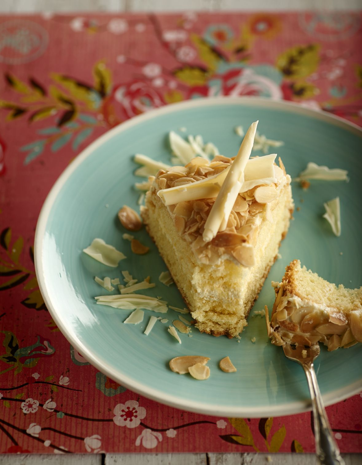 Corta el bizcocho horizontalmente por la mitad, extiende un poco de la crema de mantequilla y vuelve a juntar las dos mitades. Extiende la crema restante por la parte superior y los laterales del bizcocho, recubriendo con las almendras tostadas.