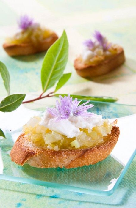 En cada rebanada de pan pon dos cucharadas de cebolla confitada, un poco de queso y cebollino fresco picado. Si quieres darle un toque de frescura, puedes decorarlas con la propia flor del cebollino.